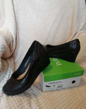 Продаю женские туфли 36 размера на танкетке из искусственной кожи темно-коричневого цвета. Туфли новые, неношеные.