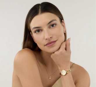 В этом наборе представлены элегантные часы с круглым циферблатом цвета шампанского, корпусом и браслетом из ионного золота.