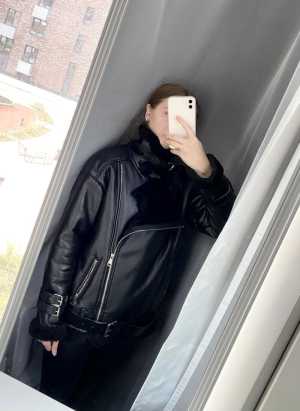 Дубленки авиатор черная. Длина по спинке 65 см. На 40-42 размер. Носилась пару раз. Мой рост 165 на фото.