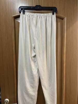 Женский костюм бежевого цвета из натурального хлопка. Верх и низ выполнены в универсальном стиле.