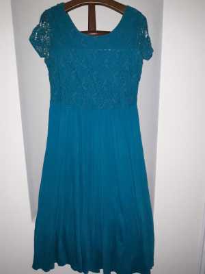 Трикотажное платье бирюзового цвета. Отрезная талия. Верх кружевной. Юбка трикотажная расклешенная удлиненная.