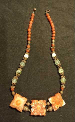 Бусы с резным сердоликом и вставками из пренита (камни натуральные). Между камнями вставки - металл.
