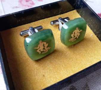 Мужские винтажные коллекционные запонки из натурального нефрита, инкрустированные мельхиором.
