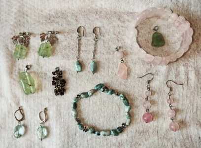 Различные украшения из натуральных камней: ларимар, пренит, розовый кварц, гранат, агат.
