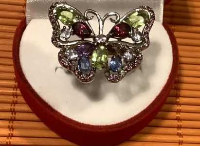 Крупное кольцо бабочка с природным камнями без обработки (хризолиты, гранаты, кианиты, топазы), родированное серебро 925...