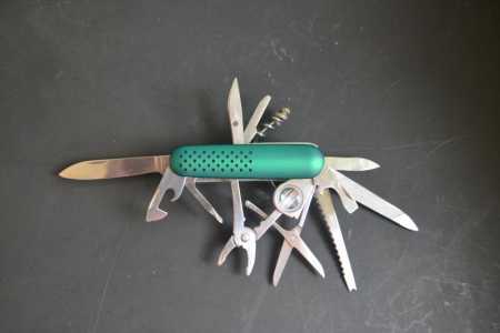 ПЕРОЧИНЫЙ НОЖ-МУЛЬТИТУЛ 17 инструментов, 89 мм. 1 . Лезвие большое 2 . Лезвие малое 3 . Напильник 4 . Линейка 5 .
