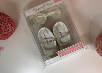 В подарочной коробке представлен комплект из двух предметов: пинетки и аксессуар на голову.