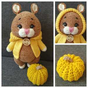 Связан из мягкой плюшевой пряжи. Кофточка снимается. Рост 18 см. Тыква в подарок : )
