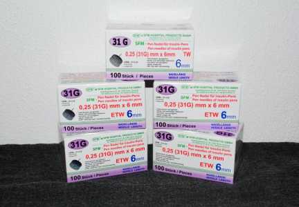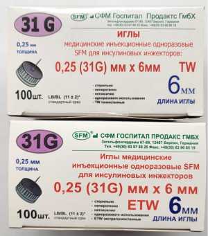 Иглы SFM Hospital Products для инсулиновых шприц-ручек 0,25*6mm (31 G) индивидуально упакованные. Пр-во Германия.