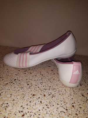 Женские балетки Adidas в бело-розовых тонах. Сверху перемычка из резинки. Размер 38 (по стельке 24,5 см.?.