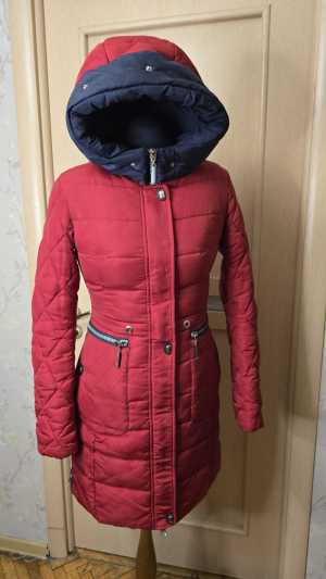 Теплый зимний пуховик на 40 - 42 размер. Длина по спинке до низа - 70 см, обхват бёдер - 84 см, рукав - 63 см.