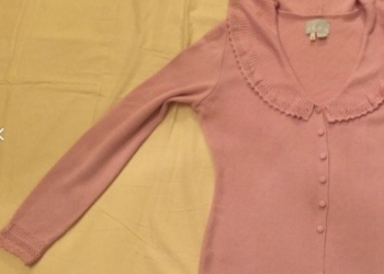Кофта вязаная, застегивается на одну пуговицу сверху, в идеальном состоянии. 50% хлопок, 50% акрил.