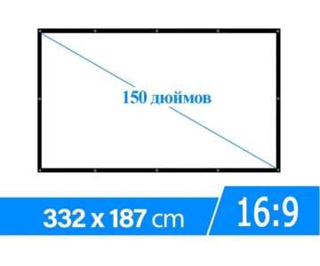 Белый экран для проектора на люверсах, размеры 100/130/150 дюймов с черными полями по бокам.