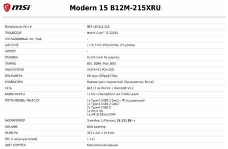 15.6" Ноутбук MSI Modern 15 B12M-215XRU, Intel Core i3-1215U, RAM 8ГБ, SSD 256ГБ, Intel UHD Graphics, Без ОС, черный.
