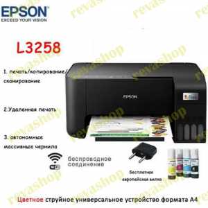 Принтер струйный Epson L3258 Epson Принтер струйный L3258, A4, Wi-Fi, USB в комплекте 4 бутылки чернил, еврозаглушки...