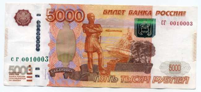 Банкнота в 5000 рублей с красивым номером № 0010003 в хорошем состояние.