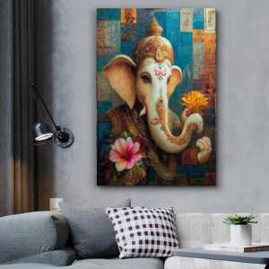 Картина маслом на холсте Слон Ганеша Шедевр Эта яркая картина Ганеши, держащего в хоботе и руке цветы, наполнена...