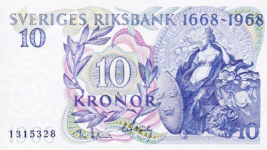 Швеция. 10 крон 1968 года. Юбилейная. 300 лет Банку Швеции.