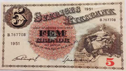 Швеция. 5 крон 1951 года. Мать Свея. Король Густав Ваза. Состояние - нормальное коллекционное. Есть еле заметный сгиб.