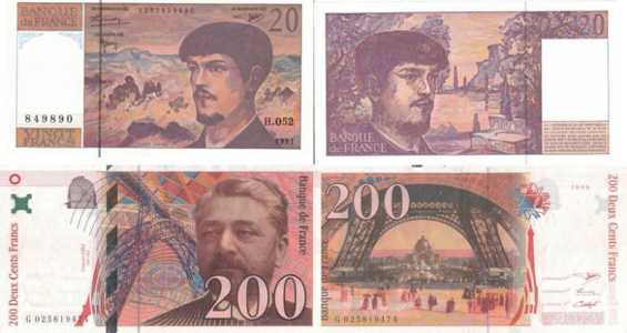 2 банкноты Франции. 1. 20 франков 1997 года 1200 руб. 2. 200 франков 1997 года 2000 руб.