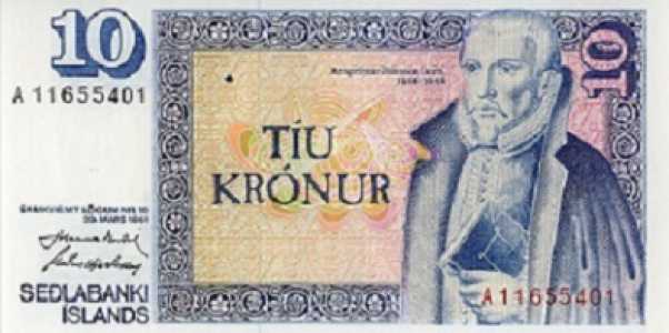 Исландия. 1. 10 крон 1961 года. Состояние - пресс. Цена 500 руб. 2. 1000 крон 2001 года.