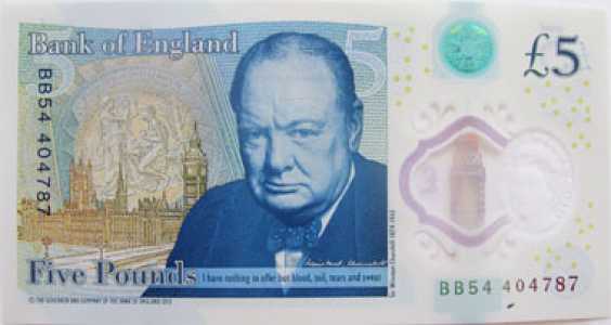 Англия. 5 фунтов 2015 года. Полимер. 50 лет со дня смерти Уинстона Черчилля. Состояние - прессовое.