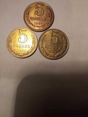 Набор монет 3шт.5коп 1991г.СССР.Оригинал.Первая верхняя ЛМД. И две снизу ММД. Состояние отличное. В блеске. Цена за набор.
