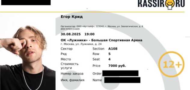 Билет на концерт Егора Крида 30.08.2025 , вип зона пришлю билеты по почте