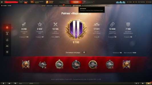 На аккаунте 8600 боев. 40 танков 10 уровня, из них 13 коллекционных и 2 премиум. 13 танков 8 и 9 уровней.