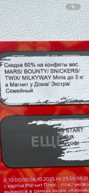 Скретч карта магнит, по которому можно купить весовые конфеты сникерс/марс/твикс/милкивей/баунти со скидкой -60%.