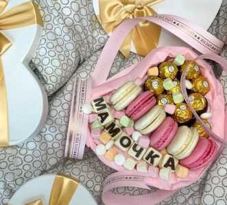 Cостав: Макаруны - 6 шт Жевательные конфеты - 100 гр Конфеты Ферерро Роше - 9 шт Шоколадные буквы - 7 шт