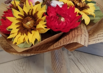 Букет из гофрированной бумаги, с конфетами Фереро Роше и Коркунов,был сделан на заказ к первому сентября, в наличии нет...