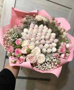 Состав: Клубника в шоколаде - 45 шт Кустовые розы - 5 шт Гипсофила - 3 шт Мы находимся в 8 городах: Москва, Воронеж...