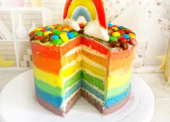 Торт на День Рождение с яркими разноцветными коржами, драже и радугой из карамели.