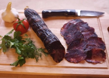 Домашняя татарская колбаса. Произведено в Нижегородской области. Состав: конское мясо, перец, чеснок, соль и сахар.