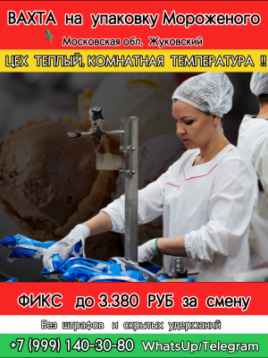 ВАХТА НА ПРОИЗВОДСТВО МОРОЖЕНОГО (ТЕПЛЫЙ ЦЕХ) ✅УПАКОВЩИЦЫ И ГРУЗЧИКИ 📍Московская обл, Жуковский 💰💰💰 СТАВКА ДО 3380 РУБ...