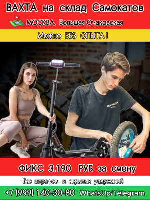 "*ВАХТА НА СКЛАД САМОКАТОВ✅РЕМОНТНИК БЕЗ ОПЫТА (М) И ПОМОЩНИЦЫ (Ж)* 📍Москва, Большая Очаковская 💰💰💰 *СТАВКА ФИКС 3190...