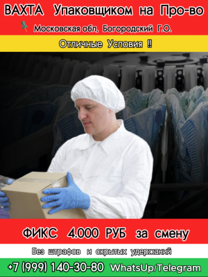 ВАХТА НА ПРОИЗВОДСТВО ПЛАСТИКОВЫХ ИЗДЕЛИЙ УПАКОВЩИКИ Московская обл, г Звенигород СТАВКА 3200 РУБ/СМЕНА 3-Х РАЗОВОЕ...