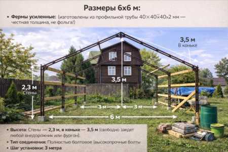 🛠 ХАРАКТЕРИСТИКИ КОМПЛЕКТА: Размеры: Ширина 6м, Длина 6м. Высота: По стене — 2.3м, в коньке — 3.5м.