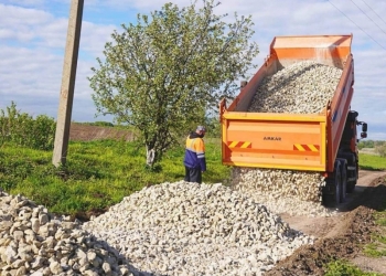 Щебень для дорог. Засыпка дороги гравием, щебнем или другими подходящими материалами. Прикатывание верхнего слоя дороги.