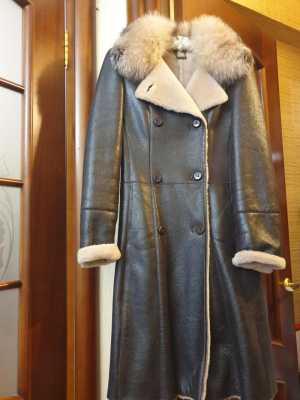 Дублёнка женская р. 42, цвет темно коричневый, воротник песец светло бежевый с темными вкраплениями.