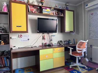 Продам стол для двоих детей с ящиками ( push and open), подвесными шкафами и полкой между ними.