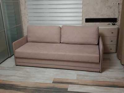 Диван-акордион очень приятной бежевой расцветки , имеет внутри ящик для постельного белья.