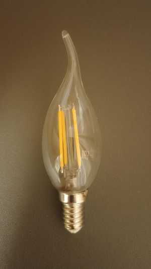 Светодиодная филаментная лампочка с цоколем Е14 обладает мощностью в 7 Вт. Цветовая температура — 2700К (тёплый свет).
