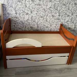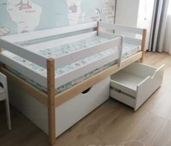 Детская кровать для детей. В комплекте съёмный бортик, двусторонний матрас, два ящика. Общий размер кровати 165*75 см.