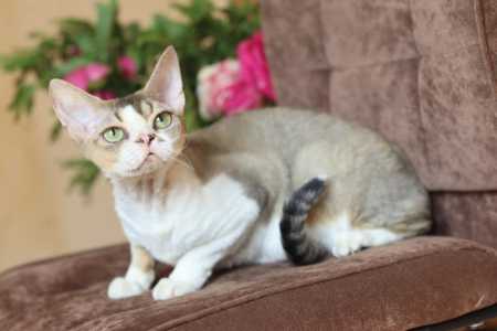 Молодая кошка породы Девон-рекс по кличке Вики. Возраст 2года. Предлагается в качестве домашнего любимца. Стерилизована.