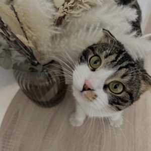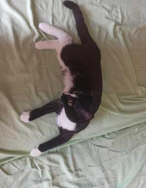 Чёрно-белый окрас. Спокойный, легко контактирует с другими и людьми. Любит играть. Не привередлив в еде.К лотку приучен.