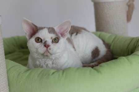 Кот Девон-рекс предлагается в качестве производителя. Возраст 3 года. Окрас Лиловый с белым. Полностью одет, без залысин.