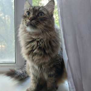 Молодая, длинношерстная милая кошка. Совершенно домашняя, ручная и позитивная.
