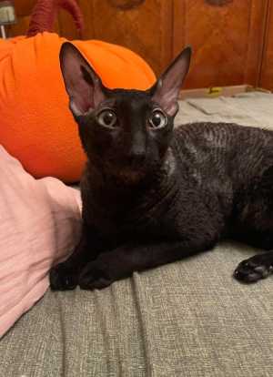 Порода :Корниш рекс Возраст : 1,5 года . Цвет ; чёрный биколор Цена вязки :3000 Домашний крупный кот.